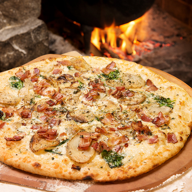 Base blanche, patate, œuf, reblochon, oignon, lardons